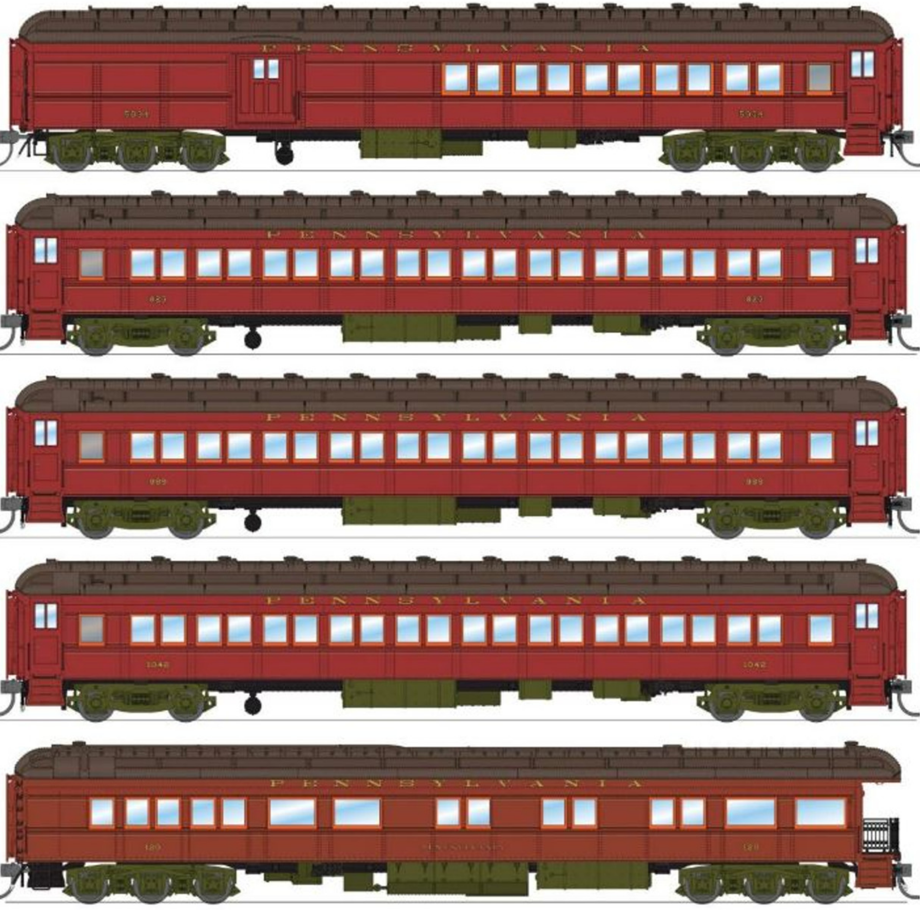 The 3 variations of five car sets are perfect for modelers who have layouts of the Pennsylvania Railroad in the 1930's, 1940's, and 1950's. With collaboration of the Pennsylvania Railroad Historical Society, these sets are sure to be great additions to your passenger fleet and will look great behind one of our many different PRR steam locomotive offerings.