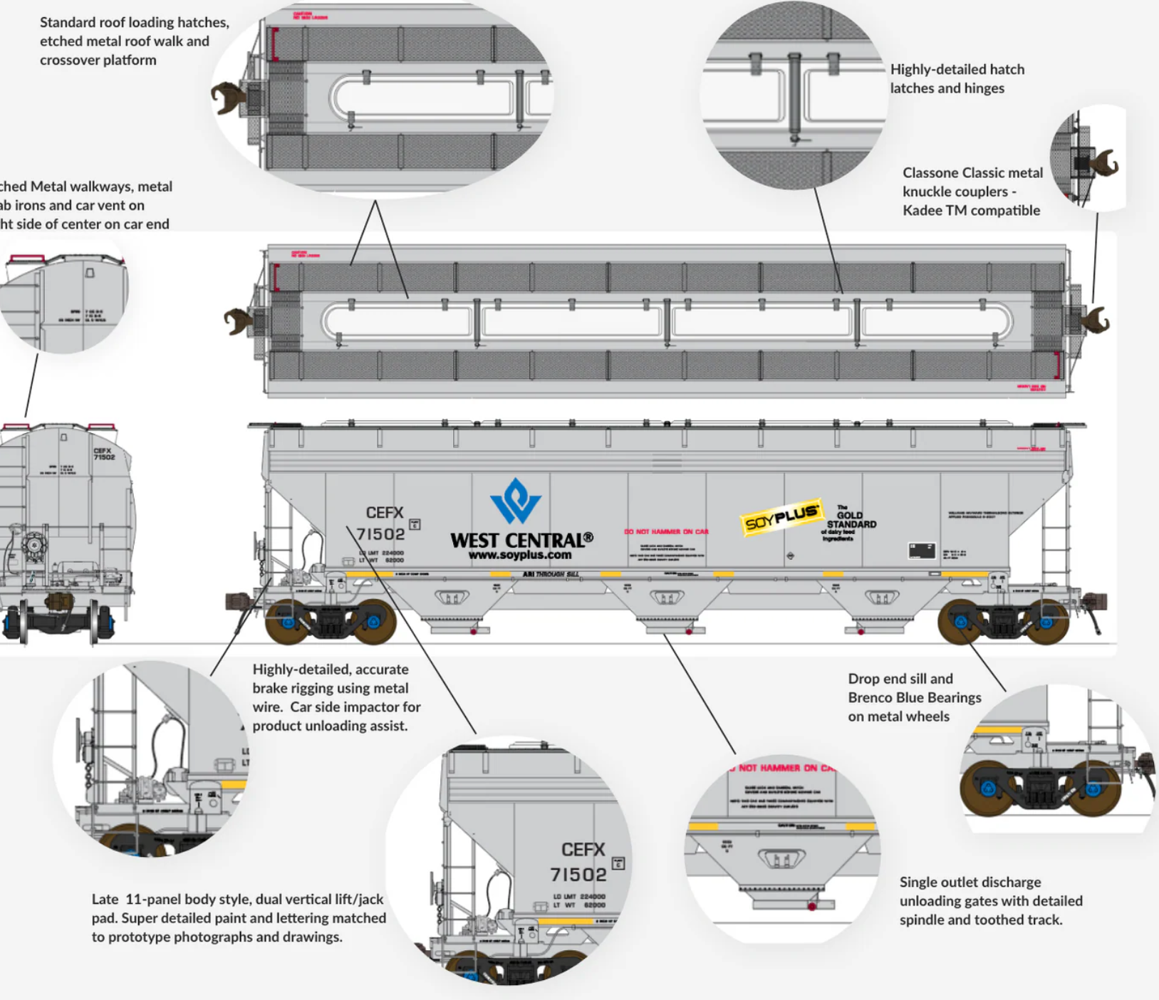 These hopper cars have been accurately reproduced from prototype drawings and hand-measured field dimensions of the prototype cars, right down to every visible detail. Classonemodelorks.com stands for accuracy and we strive to provide that with every model we produce.