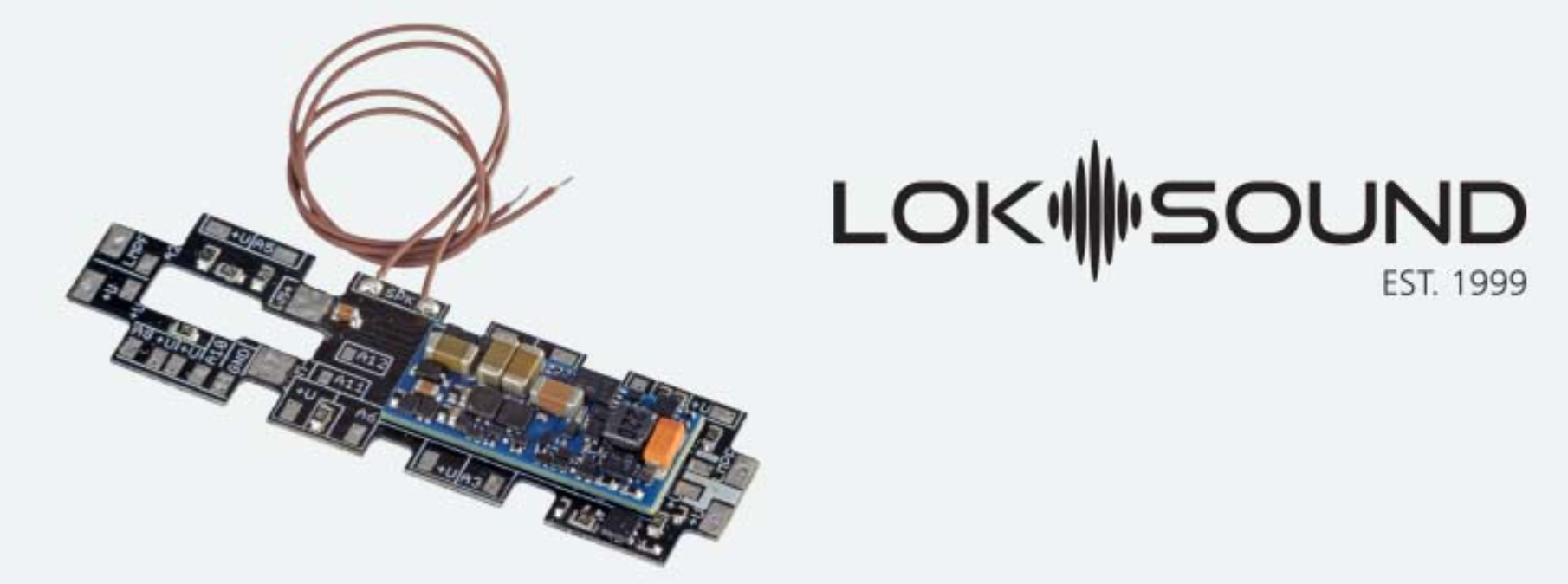 The LokSound 5 micro DCC Direct Kato USA Widebody is a “pure-bred” DCC decoder. 14 to 128 driving steps are as self-evident as 2- and 4-digit addresses. Up to 32 functions can be triggered. Thanks to RailComPlus®, the decoders log in fully to a suitable digital center. It masters all DCC programming modes and thanks to RailCom® the CV values can be read out on the main track with suitable control panels. Auxiliary regis- ters exist for control panels that can only program the CVs from 1-255.